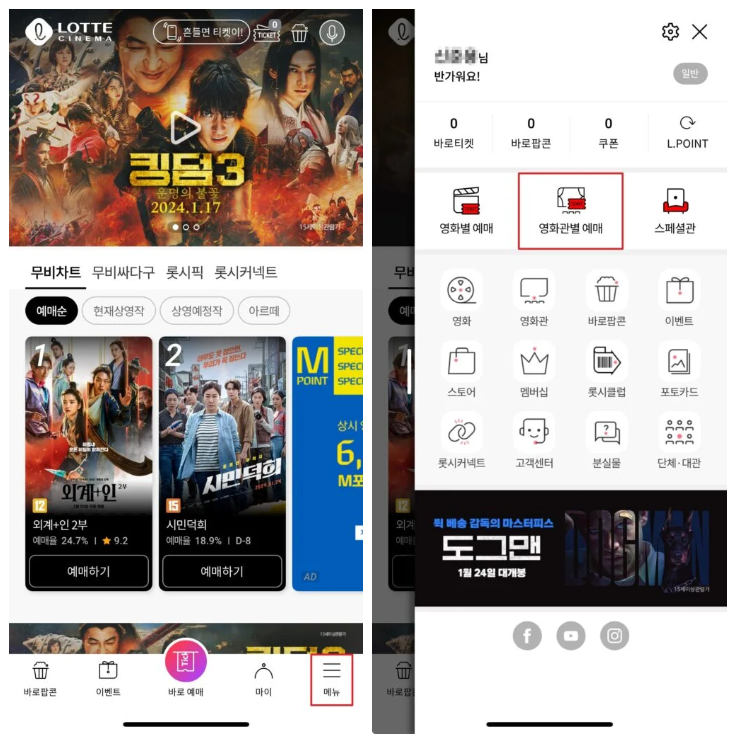 우측 하단의 메뉴 클릭 후 영화관별 예매 카테고리를 클릭합니다.