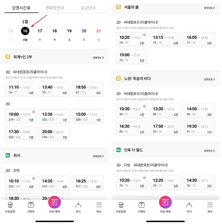 원하는 영화관과 날짜를 선택하면 상영 시간표를 확인할 수 있습니다.