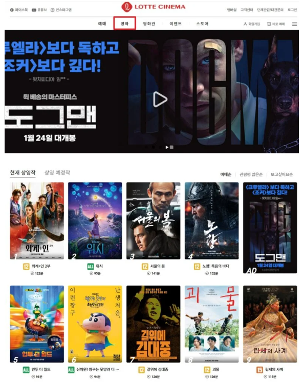 홈페이지 접속 후 상단의 영화 카테고리를 클릭한 뒤 현재 상영작을 클릭해 영화 내역 확인이 가능합니다.