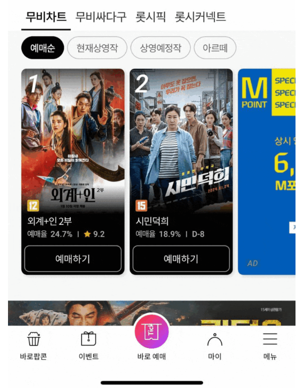 첫 화면에서 보이는 차트 혹은 현재 상영작을 클릭 후 현재 상영작을 확인할 수 있습니다.