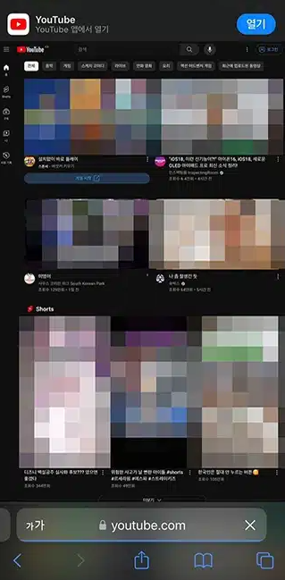 사파리 앱을 실행 후 주소창에서 유튜브 홈페이지 URL을 입력한 뒤 하단의 가가를 클릭한 후 데스크탑 웹 사이트 요청을 클릭합니다.