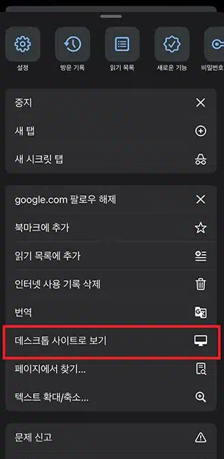 크롬 앱을 실행한 뒤 크롬 앱 하단의 점 세개를 클릭한 후 데스크톱 사이트로 보기를 선택합니다.
