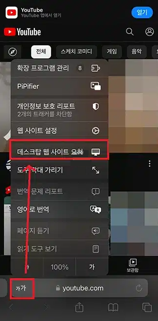 사파리 앱을 실행 후 주소창에서 유튜브 홈페이지 URL을 입력한 뒤 하단의 가가를 클릭한 후 데스크탑 웹 사이트 요청을 클릭합니다.