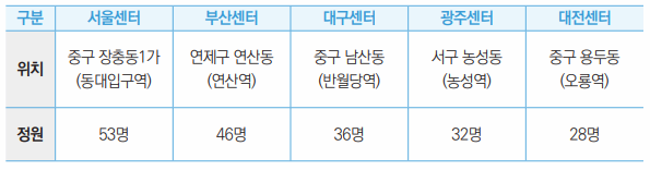 • (기숙사 현황) 전국 5개 권역(서울, 부산, 대구, 광주, 대전), 195명 수용