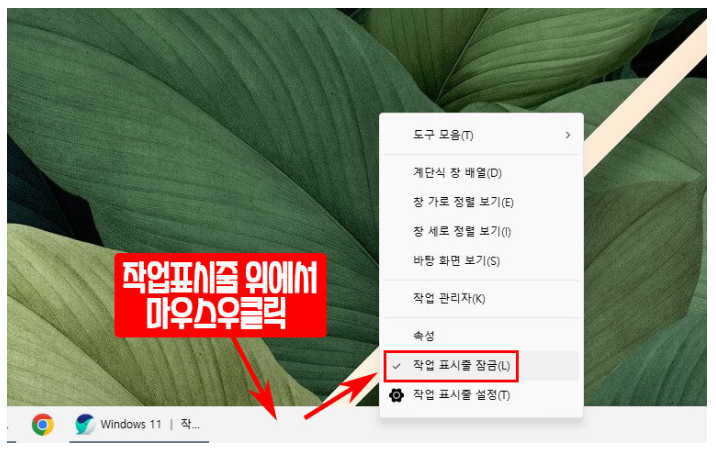 4) 완료가 되면 윈도우 10처럼 배경화면이 변경되며, 작업표시줄 위에서 우클릭을 한 뒤 작업 표시줄 잠금을 해제합니다.