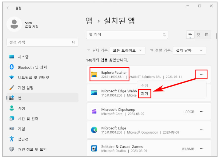 3) ExplorerPatcher 앱을 검색 후 우측 버튼을 클릭 후 제거하시면 됩니다.
