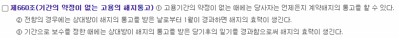 회사가 퇴사 통보 기간에 대한 근로관계를 규정하는 직접적인 규정은 없을 수 있습니다. 하지만 퇴사 통보 기간에 대하여 법적 규정이 없는 것은 아니며, 근로기준법 제26에 따라 사업주가 근로자를 해고하고자 하는 경우 30일 전에 근로자에게 통보해야 합니다. 민법 제660조는 기간의 약정이 없는 고용의 해지통보를 규정하고 있으며 이에 따라 고용 기간의 약정이 없을 때는 당사자는 언제든지 계약 해지를 통보할 수 있습니다.