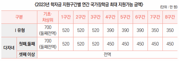 • Ⅰ유형, 다자녀 : 등록금 필수 경비(수업료)를 초과하지 않는 범위 내에서 차등 지원