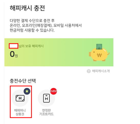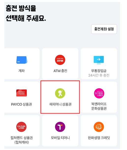 6) 충전 방식 중 해피머니 상품권을 클릭합니다.