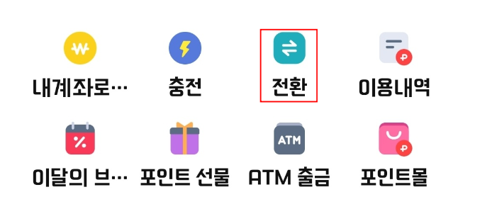 9) 페이코 포인트 충전 후, 페이코 앱 하단에 있는 전환 카테고리를 클릭합니다.