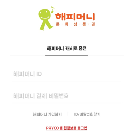 7) 해피머니 아이디와 비밀번호 입력 후 로그인을 합니다. 단, 해피머니 아이디는 본래 쓰던 아이디를 입력하시고 비밀번호는 "결제비밀번호"를 따로 발급 받으신 후 입력하셔야 합니다. 결제비밀번호는 해피머니 어플에 접속 후 우측 상단에 있는 결제비밀번호 버튼을 클릭하시면 발급이 가능하며, 결제비밀번호 6자리가 발급 됩니다. 결제비밀번호는 1시간 동안 유효하다는 점 참고하시길 바랍니다.