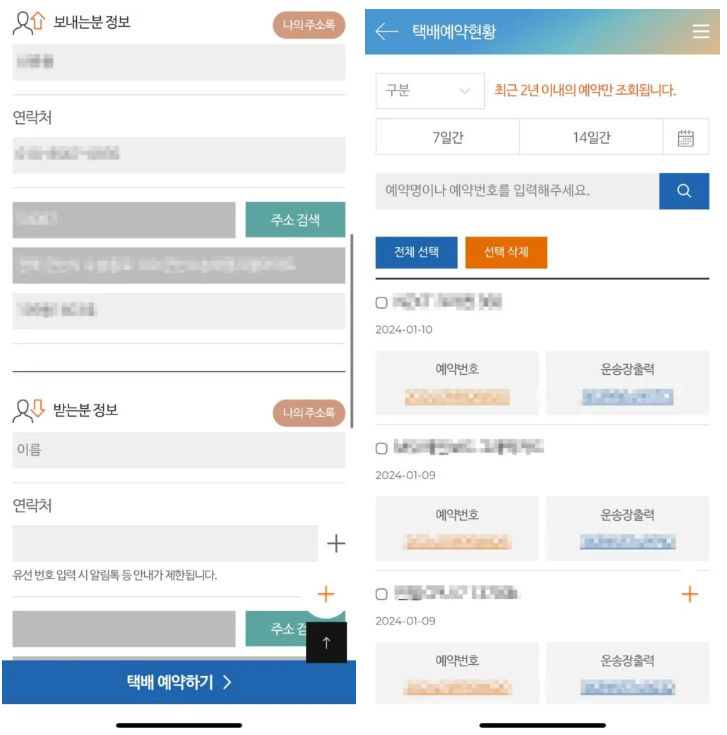 이후 보내는 분 정보와 받는 분 정보, 택배비 선후불을 선택 후 예약을 완료합니다. 예약을 한 뒤 예약현황에서 정보를 확인하고 GS25 편의점에 방문을 합니다.