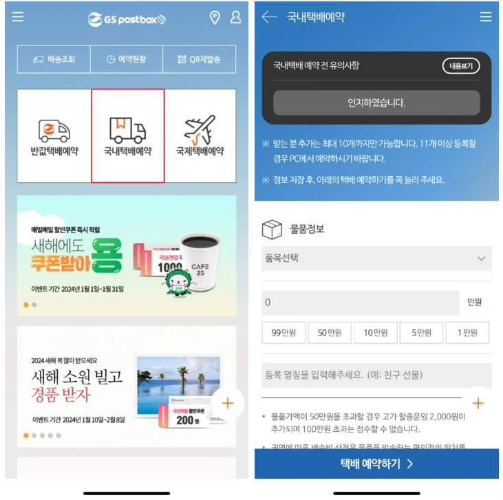 앱 설치 및 로그인을 한 뒤 중앙에 국내 택배예약을 클릭 후 물품 정보를 입력합니다.