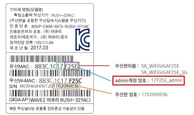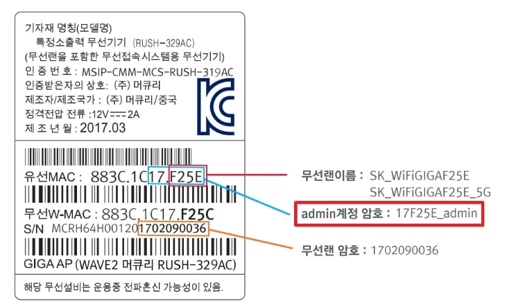 사용자 ID는 admin, 비밀번호는 공유기 하단 유선 MAC 뒤 6자리를 입력 후 _admin을 입력하시면 됩니다.