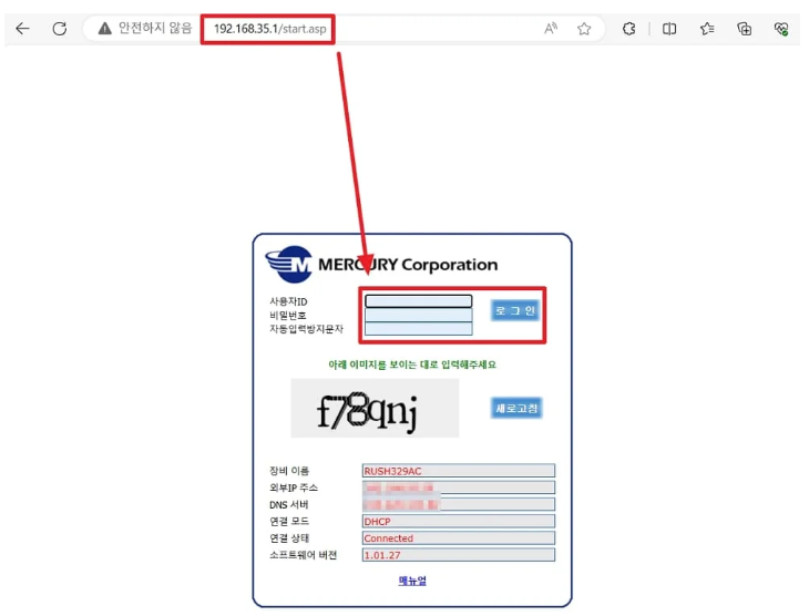 인터넷 검색창에 192.168.35.1을 검색후 ID와 비밀번호, 자동입력방지문자를 입력 후 로그인을 합니다.