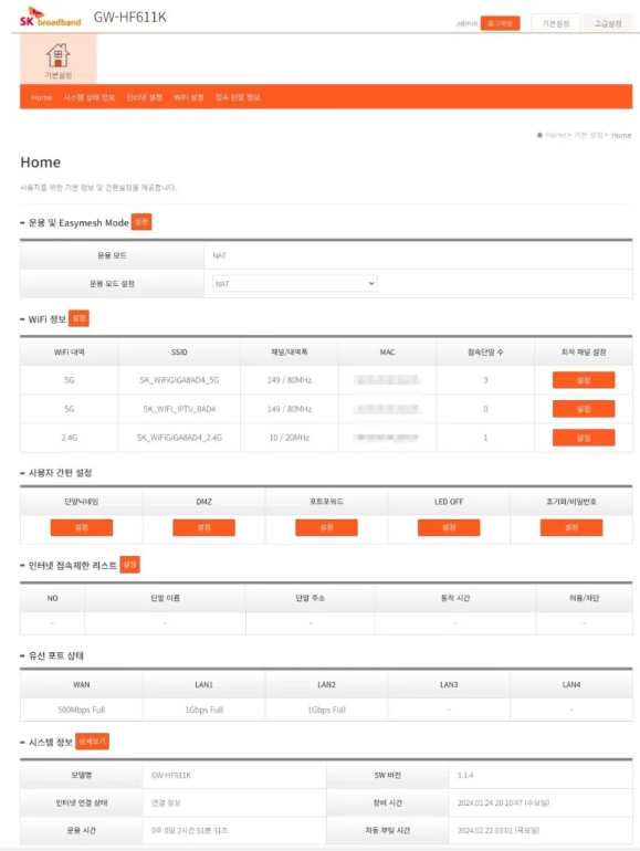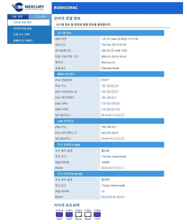 상단의 과정을 끝내게 되면 공유기 설정을 위한 관리자 페이지에 접속을 할 수 있습니다.
