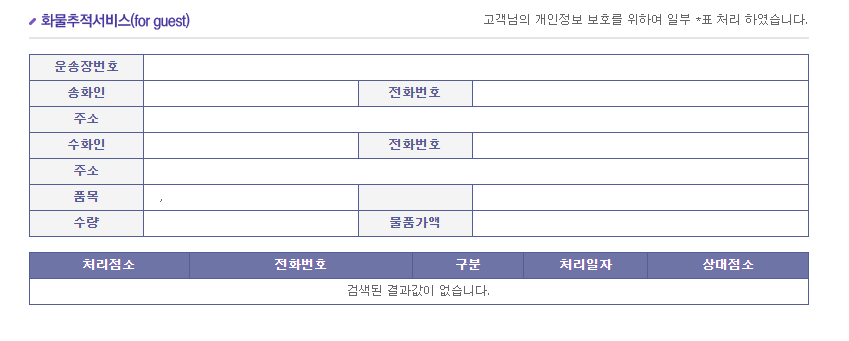 일반 조회보다 자세한 택배 배송 진행 현황과, 배송 예정 택배 기사님 정보를 확인 할 수 있습니다. 하단의 이미지를 클릭하시면 배송조회 페이지로 이동되며, 주소 맨 마지막에 본인의 운송장 번호를 입력하시면 조회가 가능합니다.
