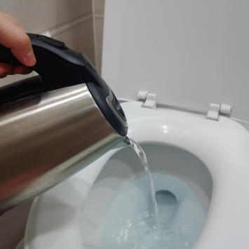 뜨거운 물에 세제를 풀어준 뒤 변기에 5분간 방치 후 물을 내립니다. 뜨거운 물은 웬만한 수용성 물질을 빠르게 녹게 해주기 때문에 휴지같이 연한 소재를 풀어지도록 도와줍니다.