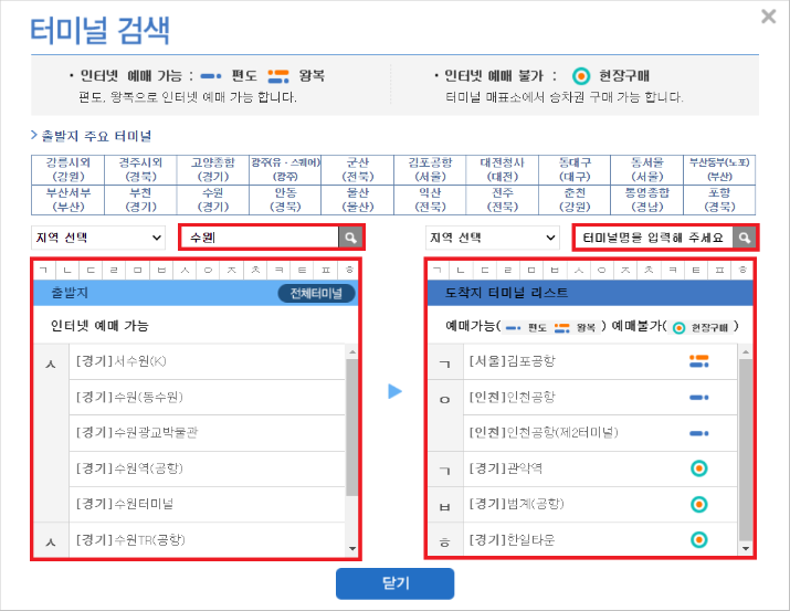 4) 출발 및 도착 터미널을 선택합니다.