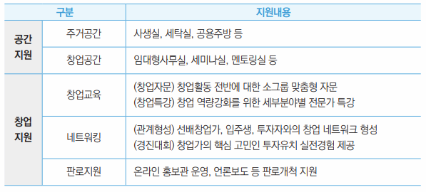 - 주거 및 창업 공간 제공, 창업지원 프로그램 무상 지원