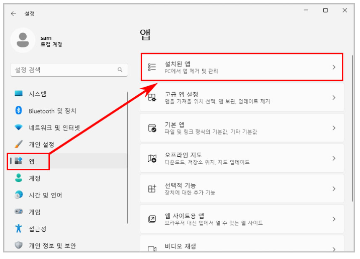 2) 앱 메뉴 클릭 후 설치된 앱을 클릭합니다.