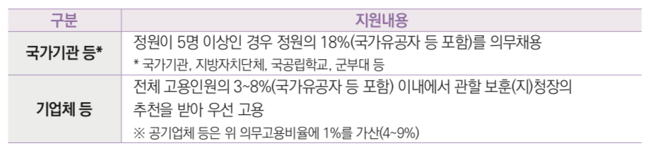 목차 국가유공자 취업 지원 제도 국가유공자 취업 지원 제도는 특별채용 대상 직렬 정원이 5명 이상인 경우 정원의 18%를 의무 채용, 전체 고용인원의 3~8% 이내에서 관할 보훈(지)청장의 추천을