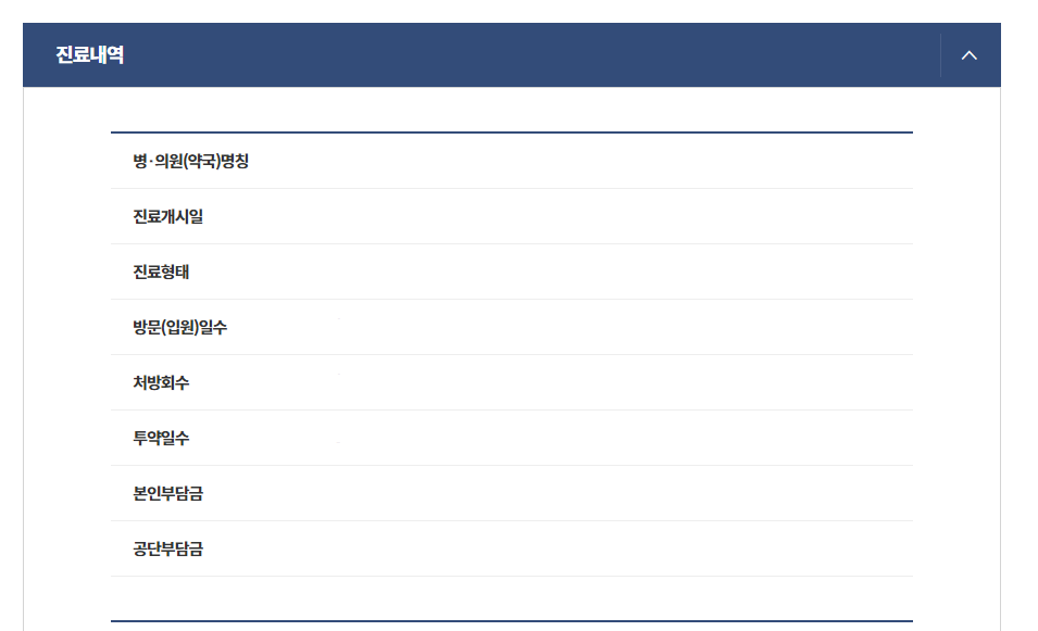 - 민감한 성병, 사생활 침해의 우려가 있는 정신과, 산부인과, 비뇨기과 등의 상병은 제공되지 않으며 발급을 원하시는 경우 신분증 지참 후 가까운 공단 지사에 방문하시면 열람 및 발급이 가능합니다.