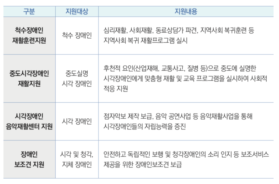 - 장애인들의 자립 능력 및 사회활동 참여를 증진하기 위한 재활프로그램 등의 서비스 제공