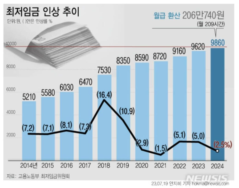 2024년도 최저임금은 시급 9,860원으로, 2023년도 대비 240원이 인상되었습니다.